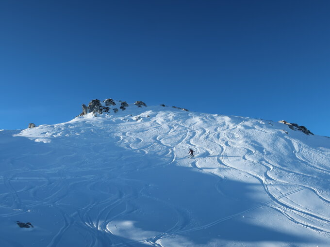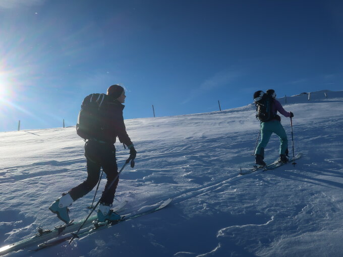 Hengstschlund winterlich eingeschneit, Spur gut, teilweise schon etwas glasig, daher haben wir z.T. eine neue Spur gelegt. Abfahrt über Schattig Riprächte mit Gegenaufstieg zum Grenchengalm, sehr lohnend(!), da am Hane recht abgeblasen. Abfahrt fast durchgehend Pulver wenn man die Nordexpositionen wählt