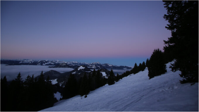Zum Skifahren aktuell nicht empfehlenswert, Bruchharsch, zwischendurch auch vereist, alles in Allem keine guten Bedingungen. Deshalb war ich heute zu Fuß unterwegs. Geht auch ohne Schneeschuhe, jedoch sind Grödel vor allem am frühen Morgen nicht schlecht, geht natürlich auch ohne.