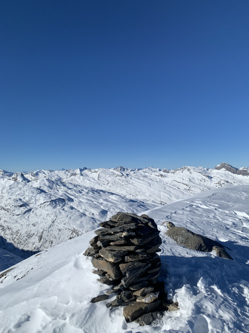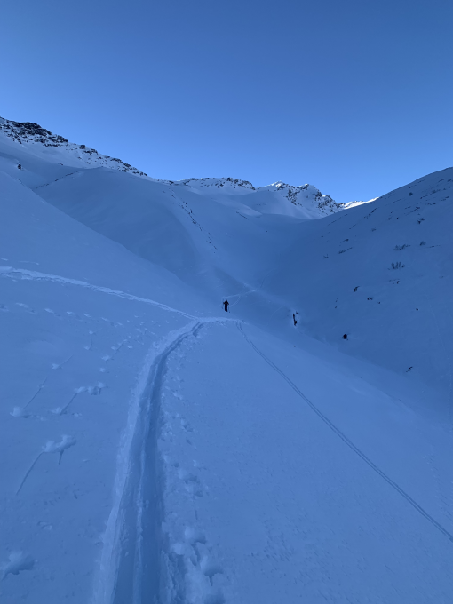 7:45 beim Stausee in Wanna bei herrlichem blauen Himmel gestartet. Bis Z'hinderst sind wir der Langlauf-Loipe gefolgt, dann haben wir uns vorsichtig durch das Flussbett bis zum Aufstieg nach Ruobstei geschlängelt - einige Steine verstecken sich unter dem Pulverschnee. Die Passage bei Ruobstei ist gut passierbar, wir haben keine Wummgeräusche gehört, danach gute Spur bis zum Gipfelhang. Der Gipfelhang ist teils stark abgeblasen, so war ab 2650 M.ü.M vor allem harter Schnee zu finden. Auf dem Gipfel angekommen trafen wir eine Dreier-Gruppe und bedankten uns für die Spurarbeit.