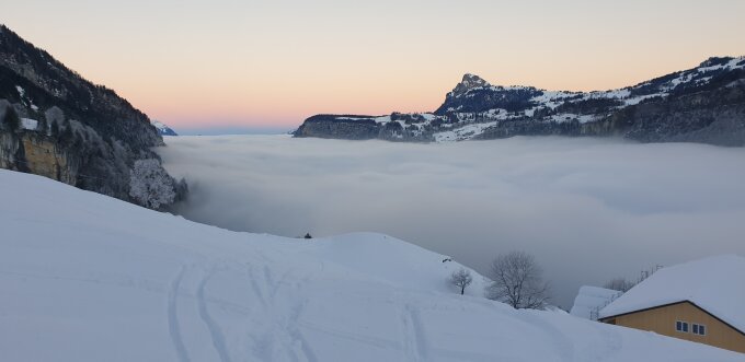 Start der Tour am 7.15 Uhr im Dorf Muotathal, das Wetter Neblig, schon recht schnell war man aus der Grauschicht, die Spur bis Rupperslaui sehr gut, wie immer ab Achslenteufi viel Windverfrachtungen, ganze Route immer noch Pulverschnee, aber schon ziemlich verfahren.