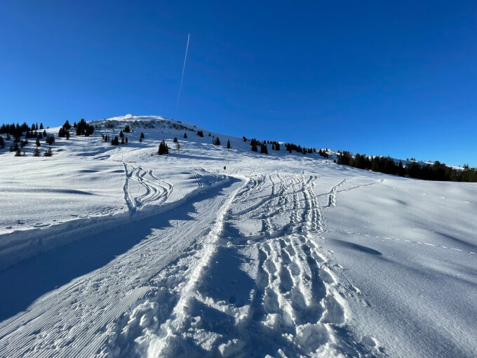 Top Powder of finest Quality im schattigen nordseitigen Gipfelhang. Die Abfahrt hinunter zur Alpe Valpun war ein top Genuss, weiter bis zum Wald unterhalb des Grossried nicht mehr ganz so sahnig, aber Immer noch gut zu schwingen. Learning für genussvolle Abfahrten dieser Tage: Gipfel >2000 m mit viel schattigem Nordhang; je höher die Ausgangslage beim Start, desto besser. Sobald's in Richtung Osten, Westen oder gar Süden geht, wird's bruchharschig. Wir hatten den Chrüz mit seiner sensationellen Aussicht in alle Richtungen bisher übersehen bei zig Touren auf Hasenflüeli und Eggberg über die Jahre. Das war ein Fehler. Heute korrigiert.