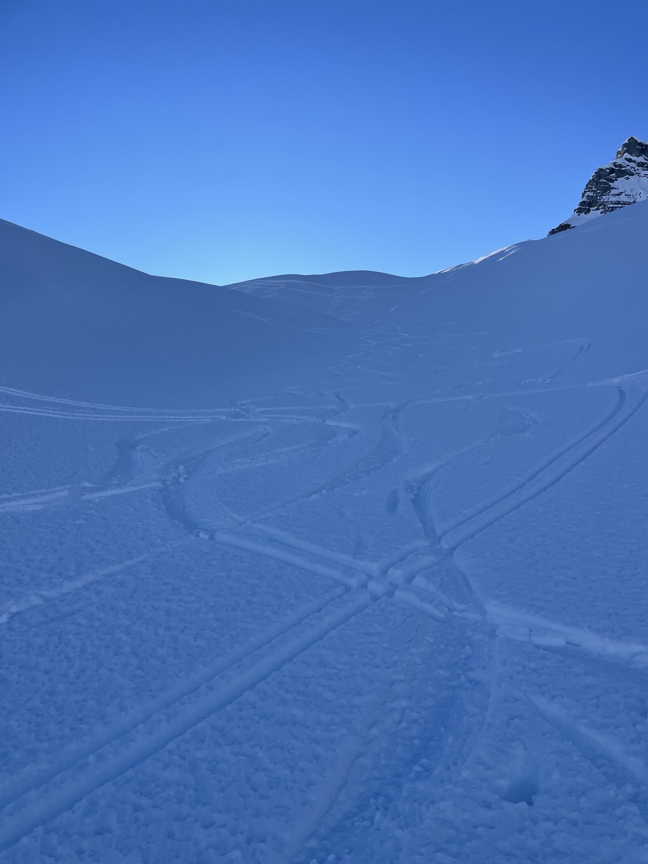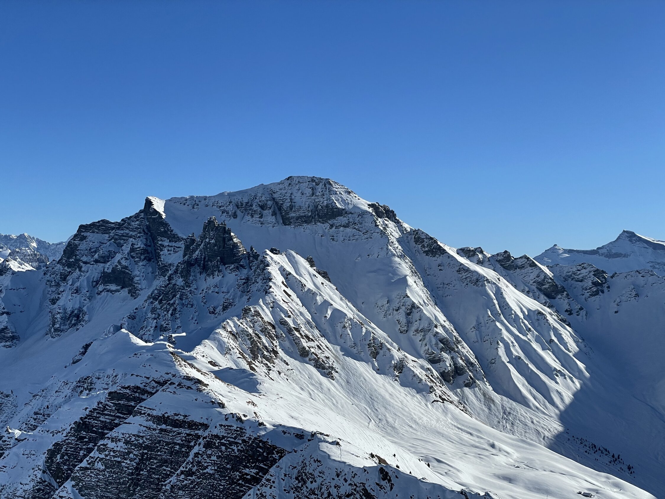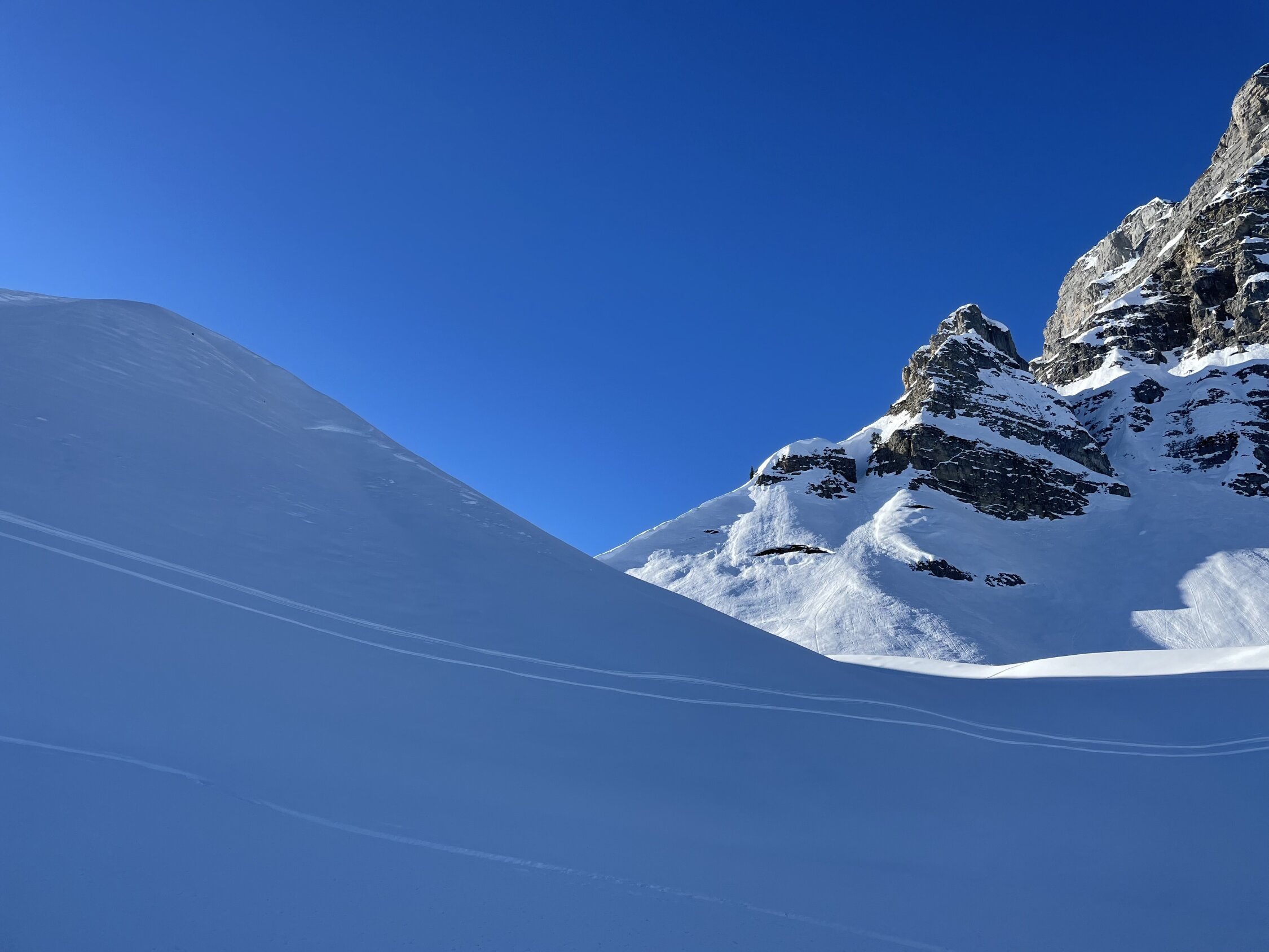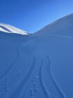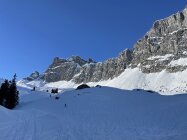 Glanzwetter und ein gut gefüllter Parkplatz liessen viel Volk erwarten. Zu meiner Überraschung traf ich aber unterwegs nicht viele Leute an. Erst in Gipfelnähe kamen dann einige herunter und oben waren wir ungefähr 10 Personen. Sehr angenehm. Oben windstill und nicht kalt. Die Abfahrt war dann im Gipfelhang soso lala, halt zerfahren oder gegen das Färmeltal hin gedeckelt. Ab der Furgg dann aber schöner Pulver und sogar noch Platz für eigene Schwünge. Weiter unten die Alpstrasse problemlos zum Fahren, der letzte Hang wiederum flotter Pulver. Erstaunlich, wie sich der gehalten hat.