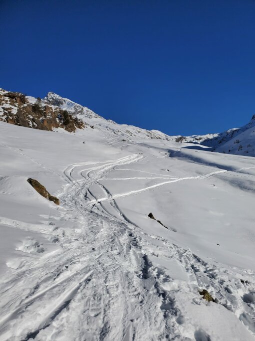 Stellenweise wenig Schnee und dementsprechend eher steinig.