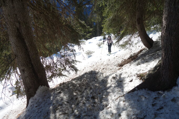 Sonnenhänge teilweise hart, sind am Samstag bei den warmen Temperaturen aber sogar aufgesulzt. Oben verblasen, aber teils noch guter Presspulver gefunden. Im Wald manchmal etwas mühsam in der Abfahrt.