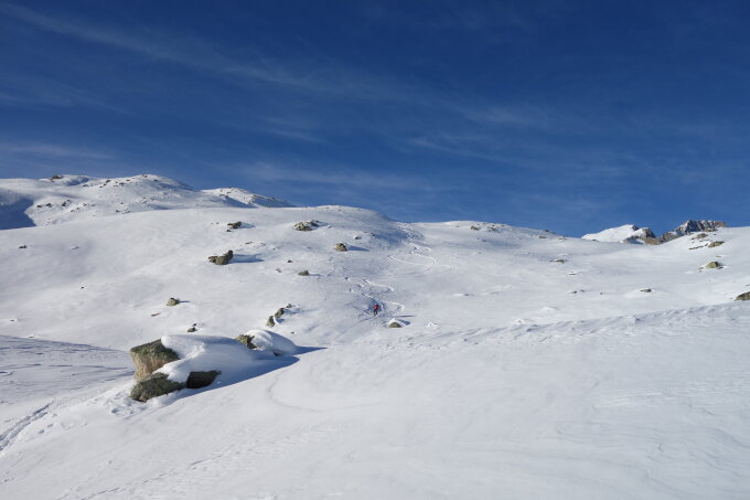 Es hat relativ wenig Schnee im Gebiet, daher muss auf die Steine aufgepasst werden.