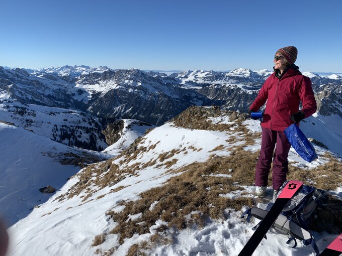 Westlich des Gipfels bis auf die Krete hochgestiegen. Herrlicher Pulver mit genügend Platz für eigene Spuren. Weiter unten natürlich verfahren.