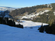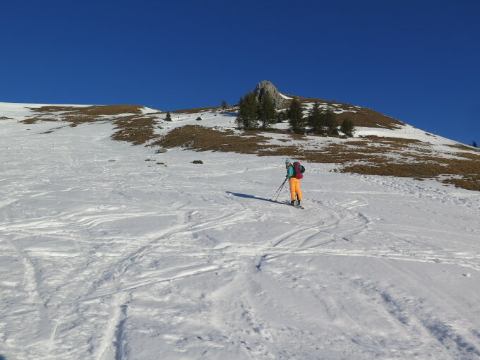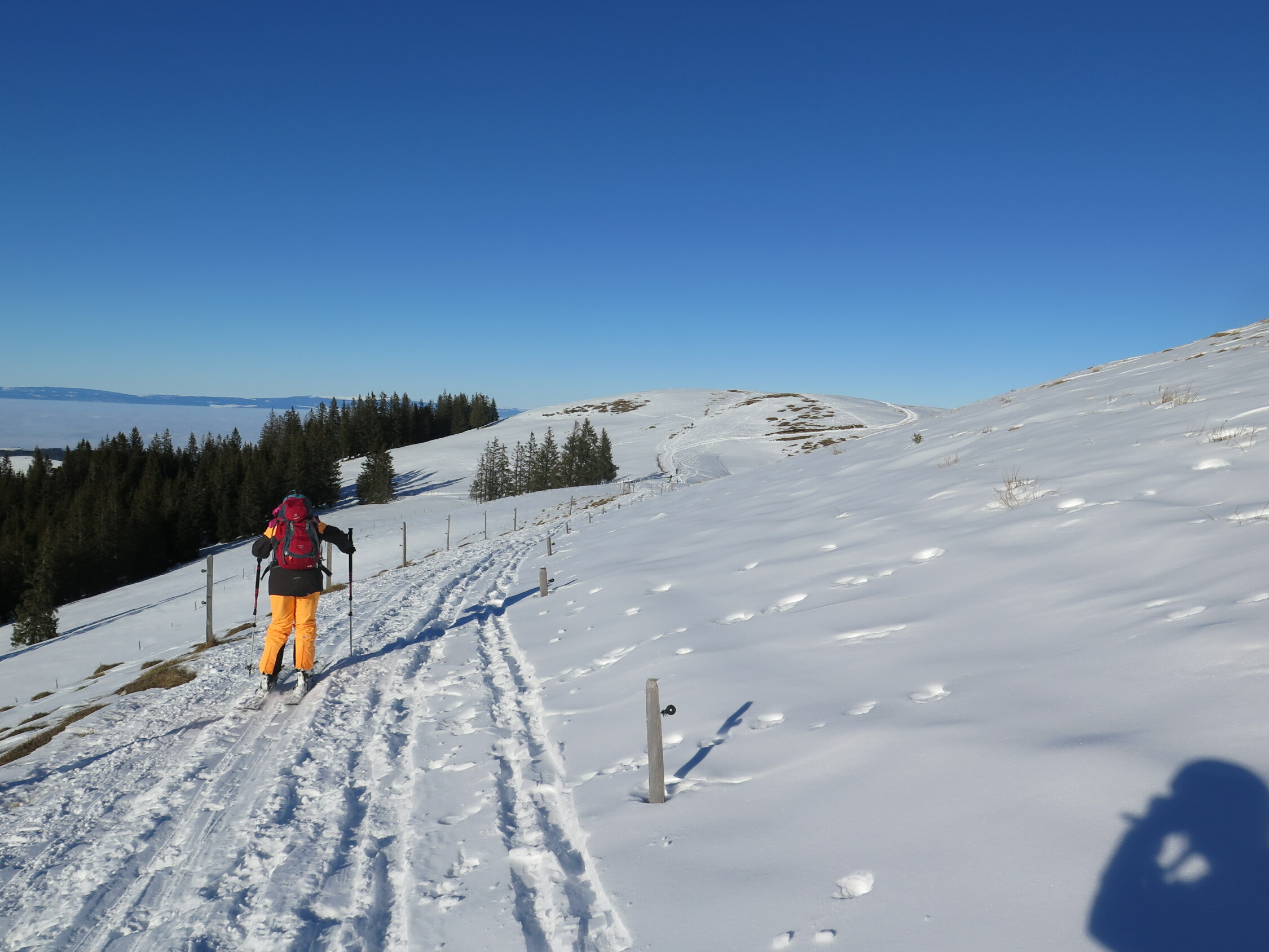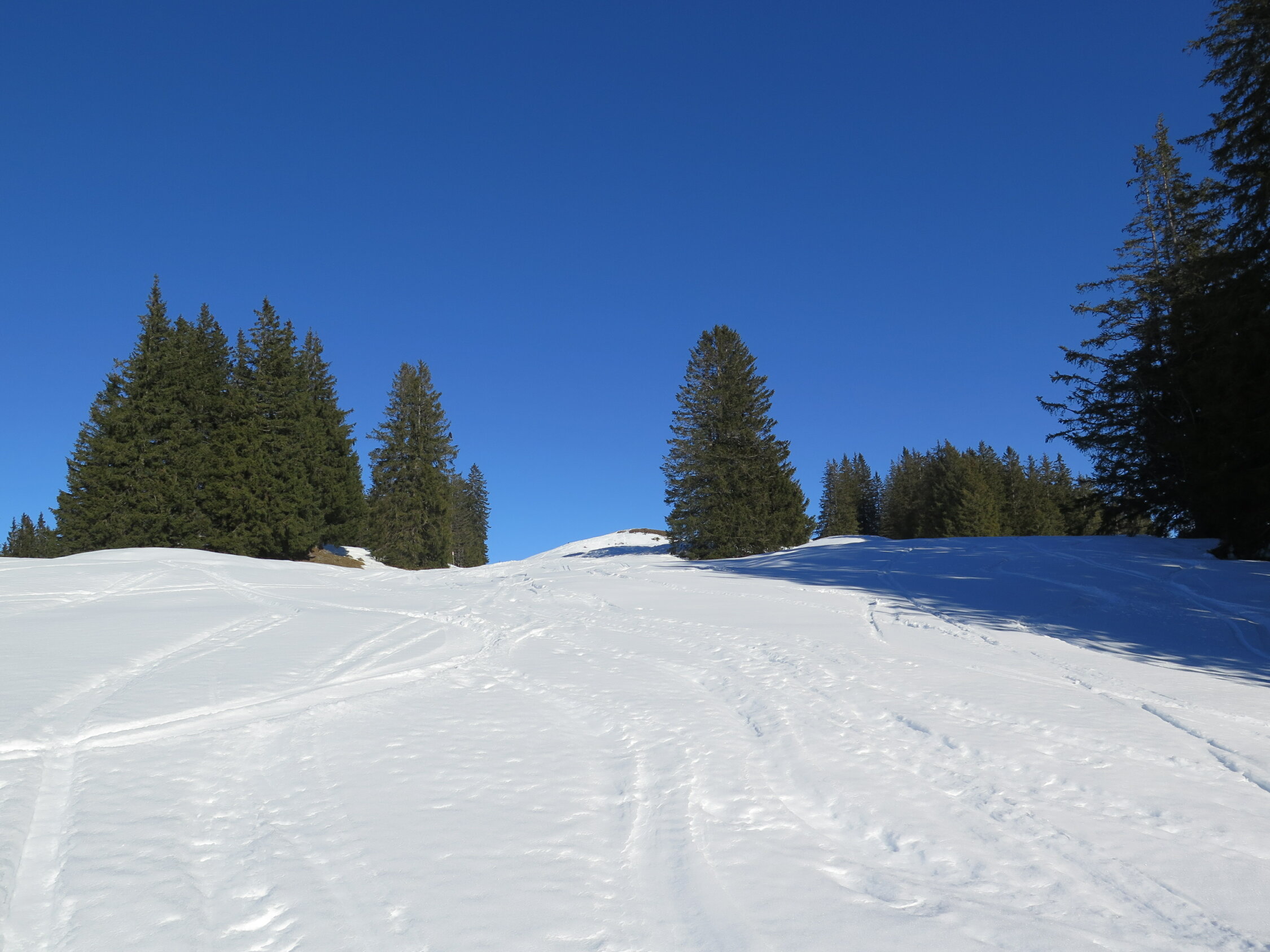 Es kann noch im moment gut ins Zollhaus runtergefahren werden. Oberhalb Zollhaus im Schatten grösserer Oberflächenreif auf der Schneedecke.