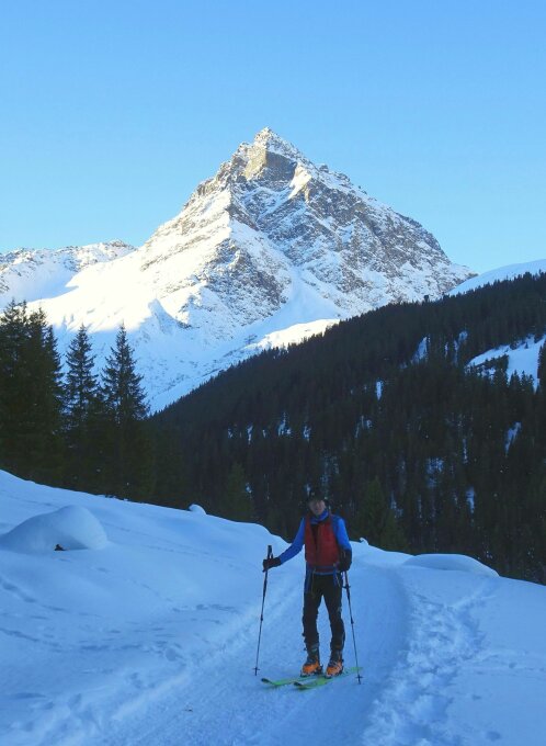 Kleinere Grundlawine am Anfang des Vergaldatals, vermutlich aus den ersten Tagen nach dem Schneefall. Besser auf dem unteren Weg queren. Der lange Rückweg talauswärts geht erstaunlich zügig mit nur wenig Anschieben.