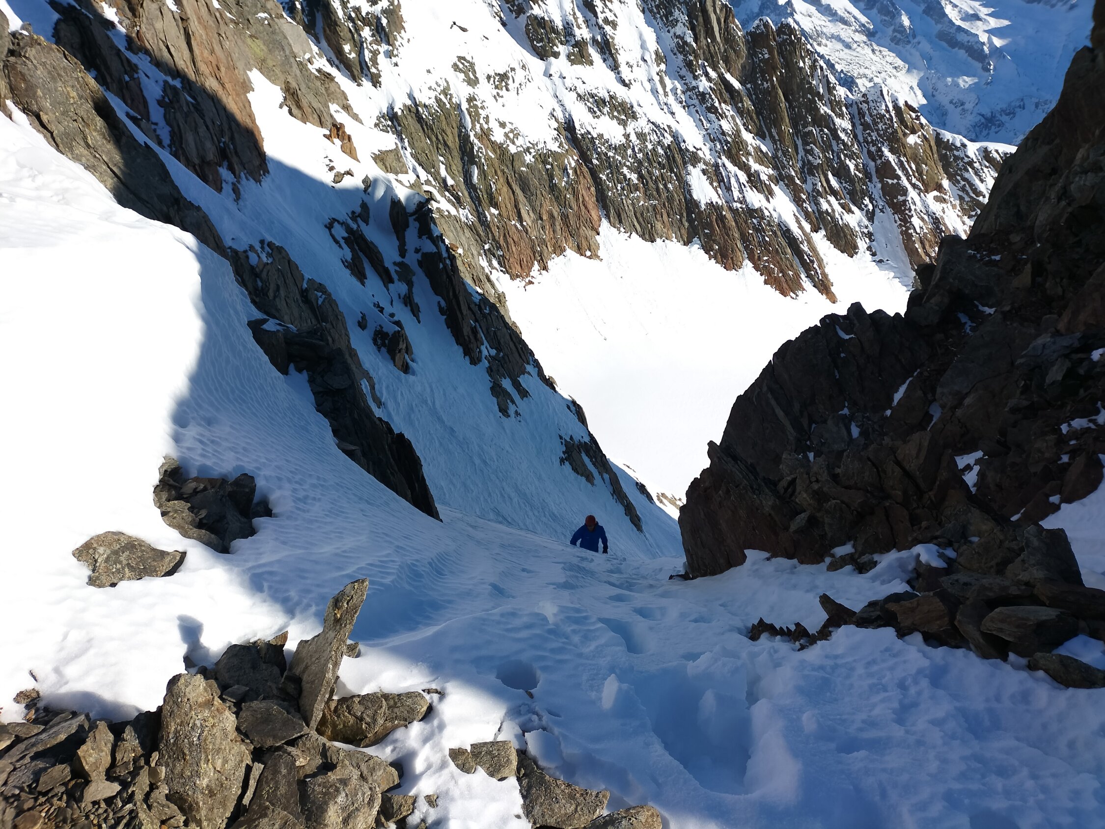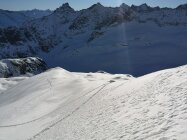 Im Aufstieg von Handegg zur Grübenhütte gute Bedingungen. Das Coulour östlich des Seelis ist etwas rutschig aber machbar. Nach der Hütte geht es ohne Probleme richtung Golegghorn. Das Coulour richtung Gaulihütte ist mit gutem Trittschnee bestückt und somit ohne Steigeisen und Eisgerät machtbar. Es bleibt jedoch recht steil.