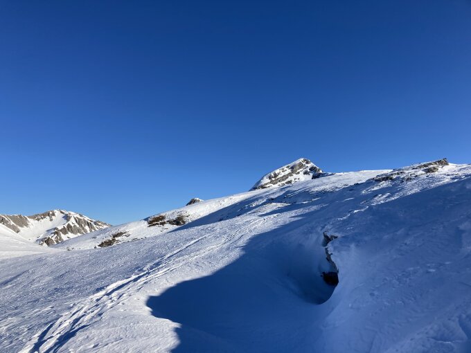 Spur durch den Wald eher glasig und hart, weiter oben zwischen Presspulver, hart und windbearbeitet alles zu haben. Gipfelaufstieg problemlos möglich, mit Leichtsteigeisen und Pickel sehr komfortabel.