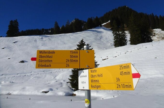 Reutigen - Mattehubel - Oey Diemtigen Reutigen Dorf 621m – Kirchweg – Simmenfluhweg – Längenweg - Grodweg – Grabenweg – Pkt.771 – Chratzhaltegrabe – Lasihütte – Längenbergalp 1274m – Pkt.1503 – Alpwirtschaft Matten 1565m – Mattehubel 1618m - Steinig Nacki 1606m – Matte – Spittelnacki 1435m – Müllersbode 1372m – Pkt.1183 – Pkt.1101 – Pkt.925 - Unter dem Kalckofen –Allmenden 850m – Laterbach 699m – Oey Diemtigen Bhf 669m