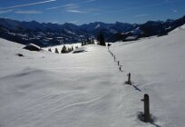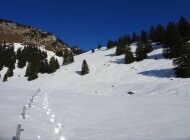 schattseitig und zonal strenge Spurarbeit im Pulverschnee oberhalb Waldgrenze