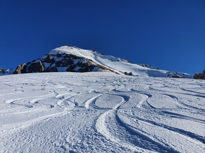 Je nach Hangexposition von Bruchharst bis Pulver... bei entsprechender Routenwahl noch viele Pulverschwünge möglich.