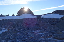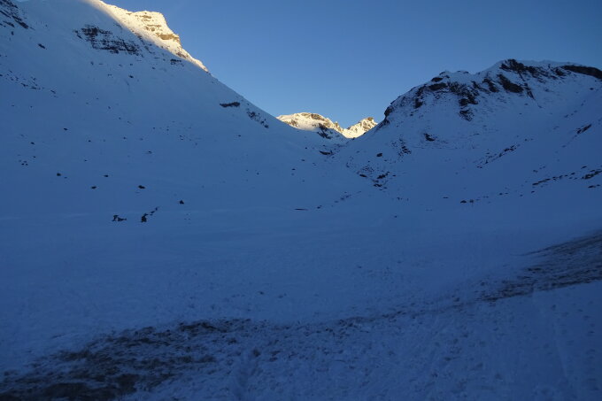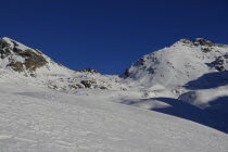 Auf der ganzen Strecke vom Wind bearbeiteter Hartschnee. Bis zur Fuorcla d'Agnel sind die Schneeverhältnisse gut. Nordseitig ist die Fuorcla stark ausgeapert. Auf der rechten Seite findet man am ehesten noch Schnee. Übergang auf den Vadret d'Agnel muss man etwas suchen, ist aber kein Problem. Im Fussaufstieg auf den Piz d'Agnel sind die Verhältnisse sehr gut (die Spur sieht aus der Ferne exponierter aus, als sie tatsächlich ist).