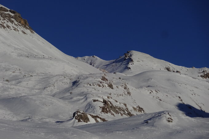 Zuunterst noch etwas Pulver, sonst auf der ganzen Strecke Hartschnee und Bruchharsch. Der Grat vor dem Schlusshang ist an vielen Stellen abgeblasen; man muss sich den Weg zwischen den Steinen suchen. Spur im Gipfelhang ist gut angelegt. Im oberen Teil war die Spur heute allerdings sehr glasig, weshalb Harscheisen empfehlenswert sind. Abfahrt war mit den Skiern eher ein Kampf; mit dem Splitboard ging es einigermassen.