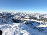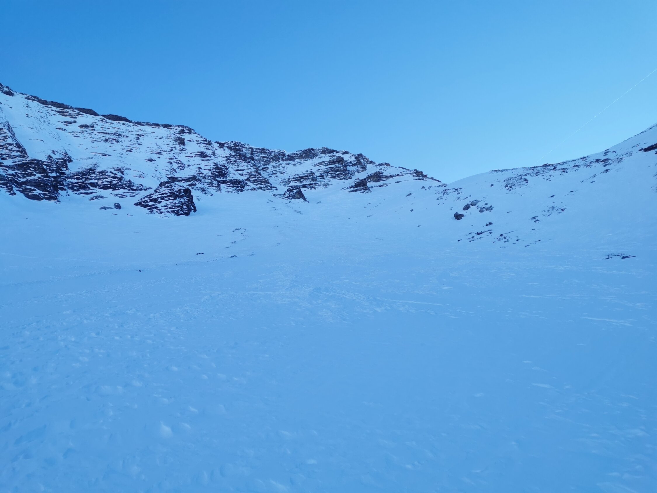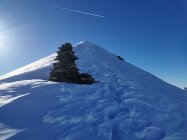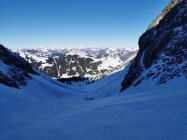 Für den Aufstieg waren die Verhältnisse durch das Berzgummloch gut. Der Schnee ist windgepresst und entsprechend hart aber griffig. Beim Aufstieg durchs Nordcouloir habe ich Steigeisen verwendet, da ich auf die Felsen ausgewichen bin. Es geht aber auch ohne.