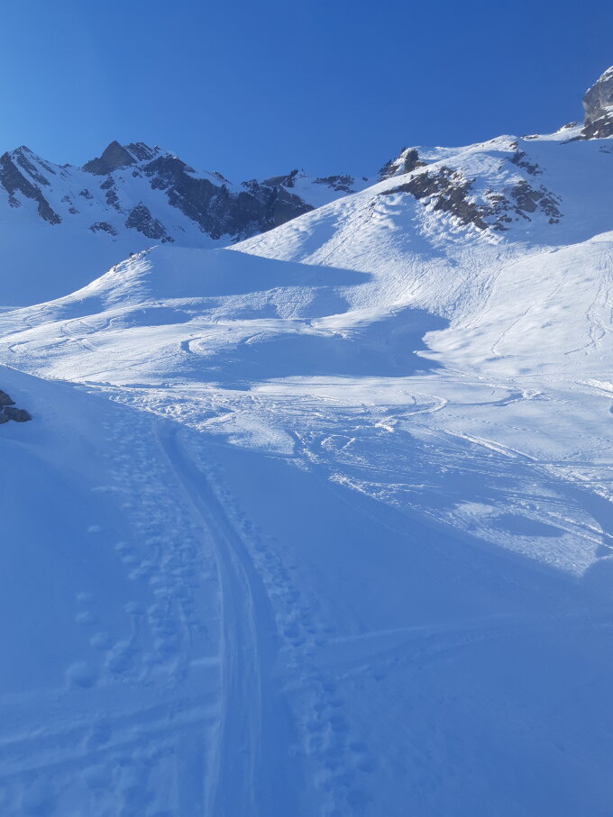 Schneeverhältnisse recht unterschiedlich und mühsam zu fahren..es wechseln gepresste Pulver mit harten abgeblasenen Stellen ab. Zudem ist häufig ein leichter Deckel anzufinden..