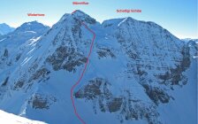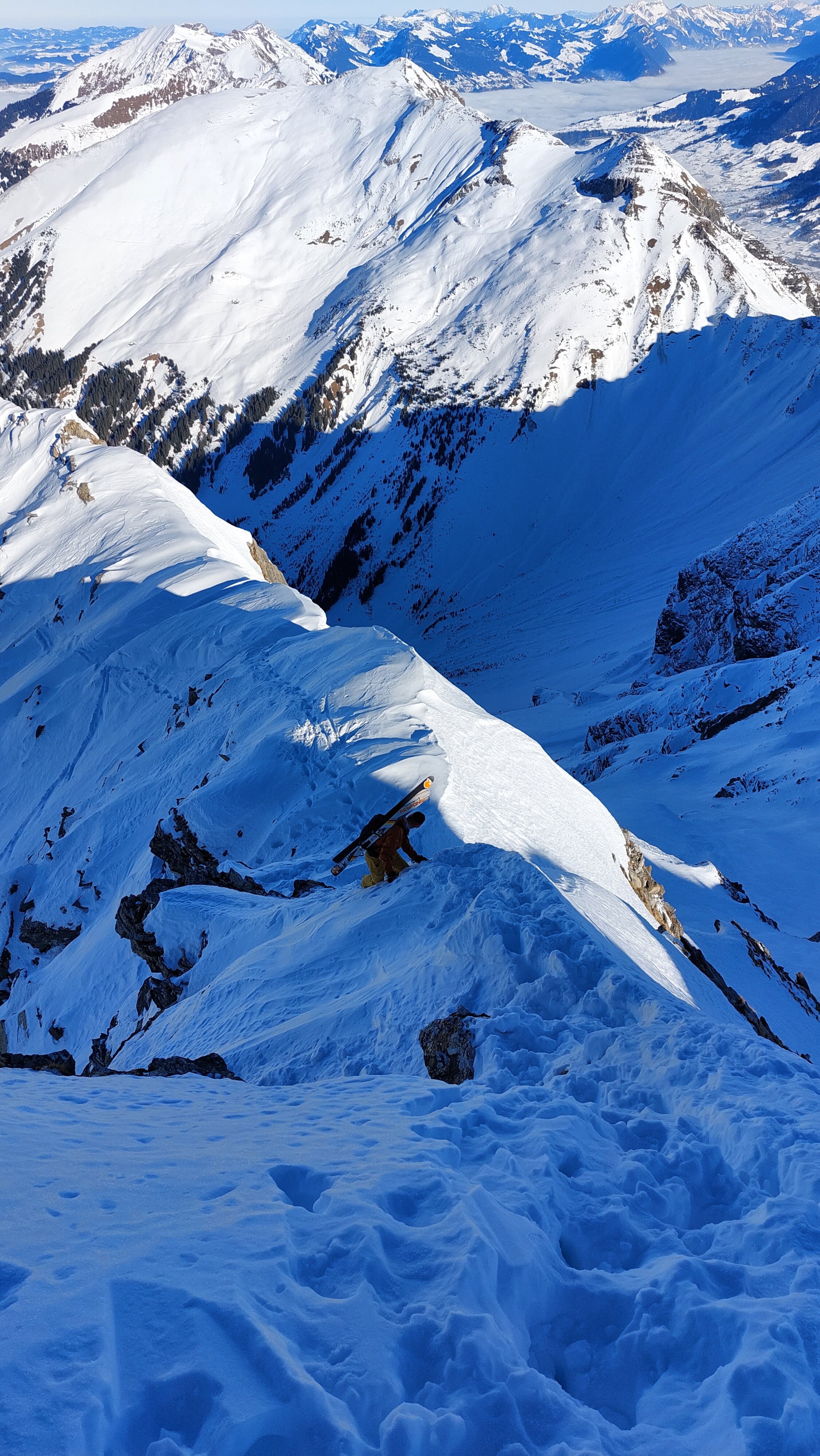 Abfahrt Gurbstal = Pressschnee und tw Pulver - gute Stufen in Gratpartie Gipfel zum Sattel auf 2610m – ab da Einstieg in den 45°-Westhang erste Meter steinig (Sprung;), dann bis unten überall viel Schnee...