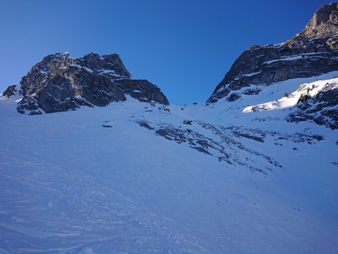 Viel Schnee und kein Steinkontakt. Die Hänge sind zerfahren. Mit dem Wind hat's stellenweise frischen Presspulver gegeben, der sich schön fahren lässt.