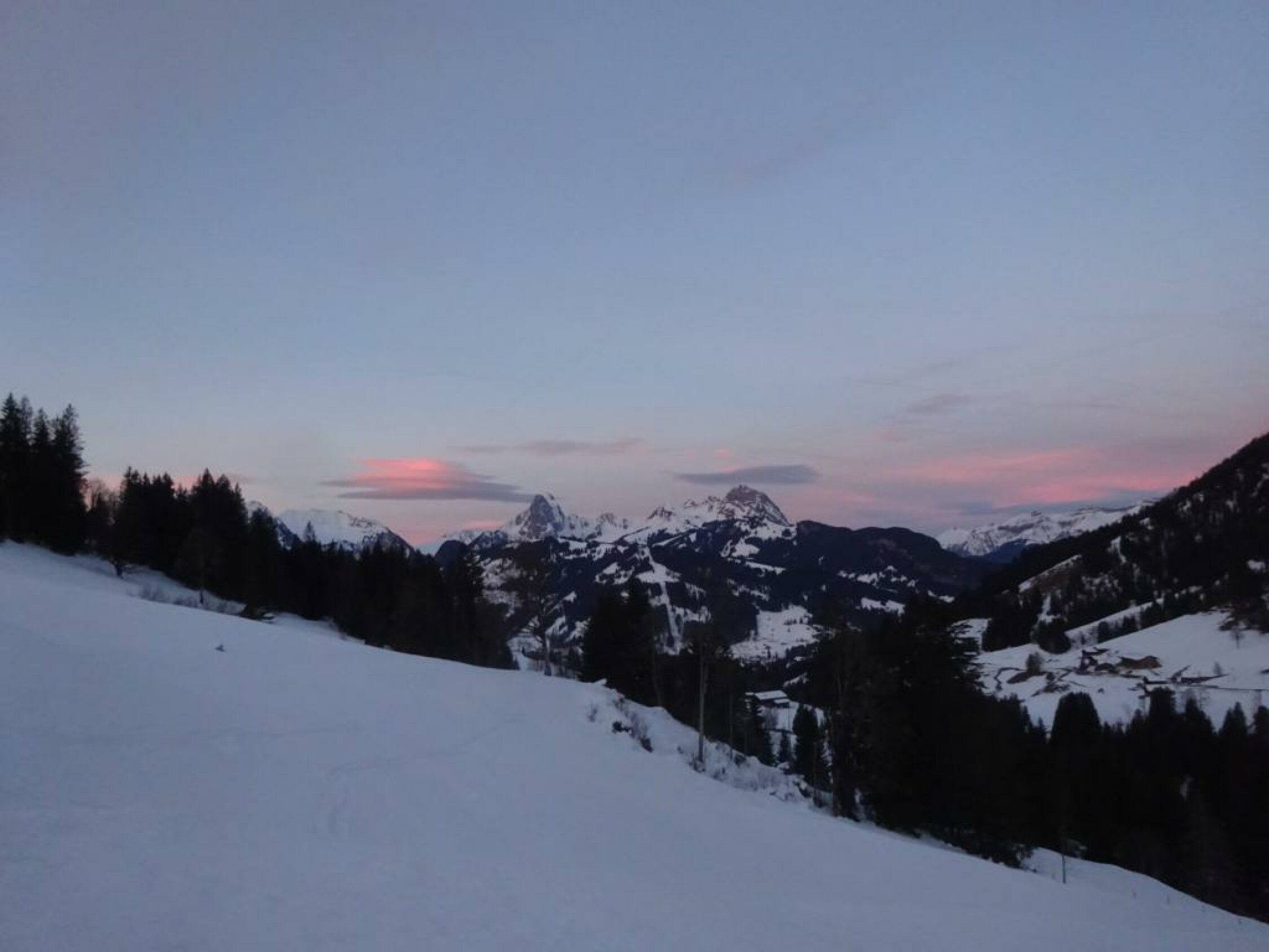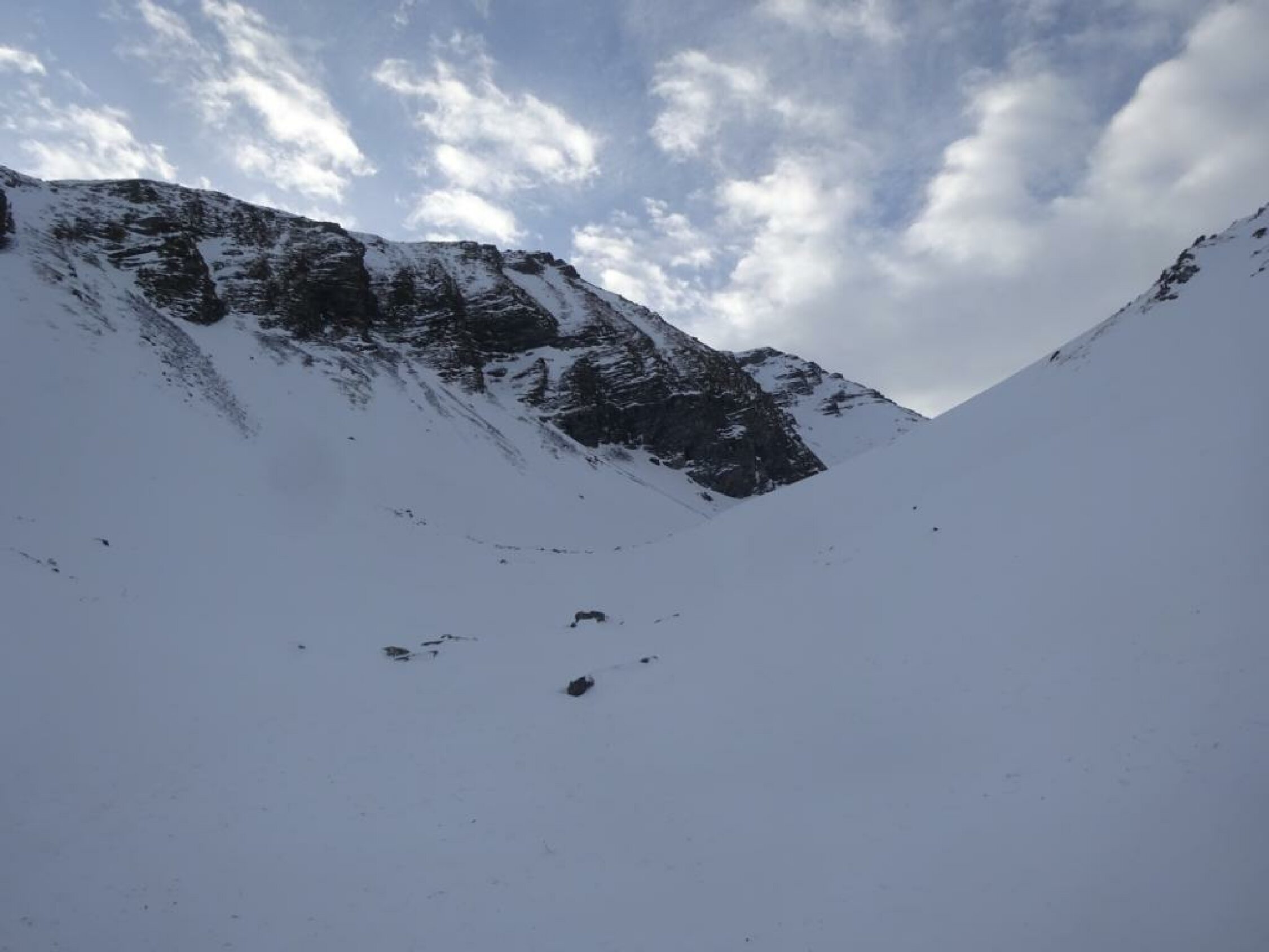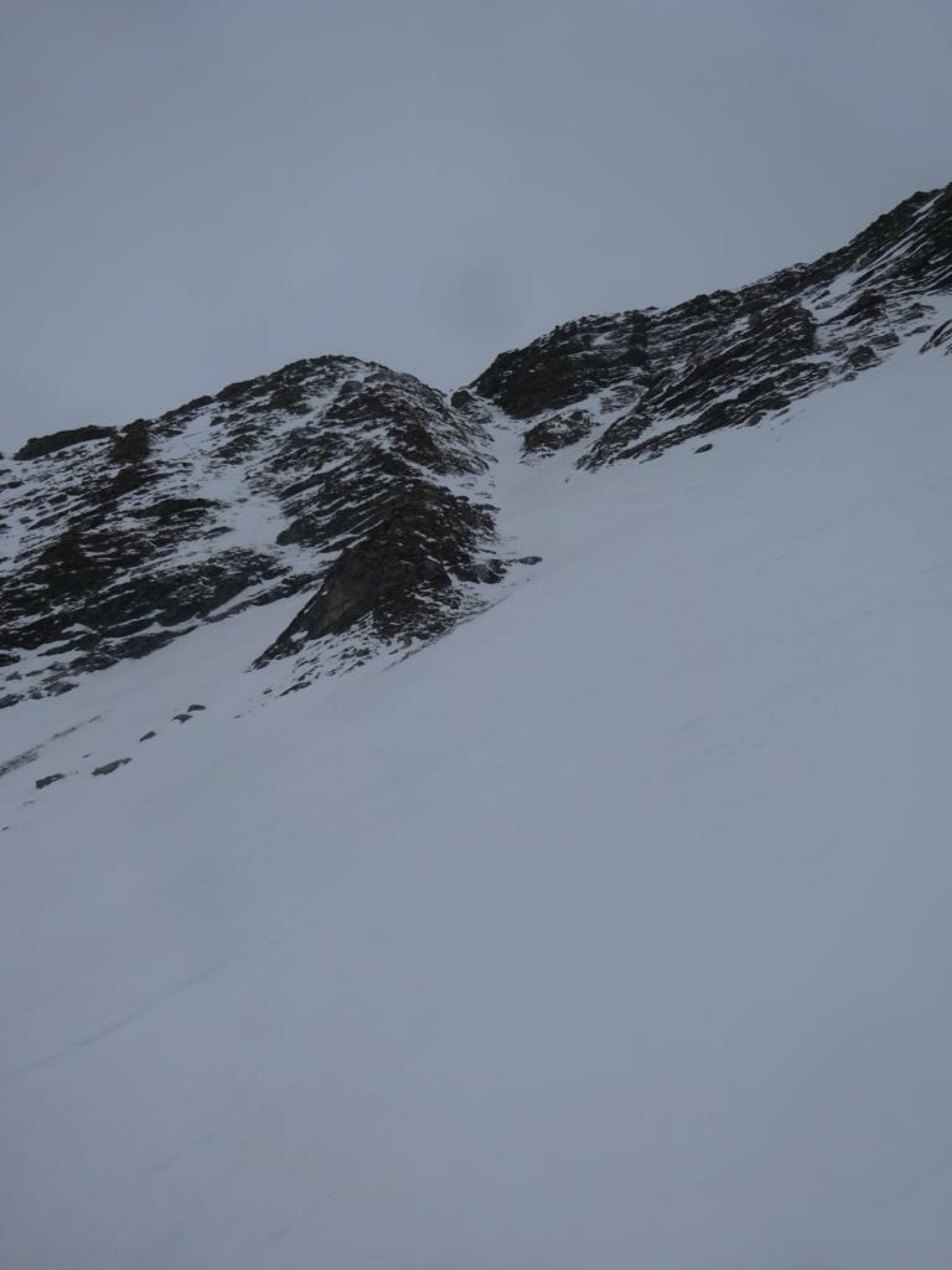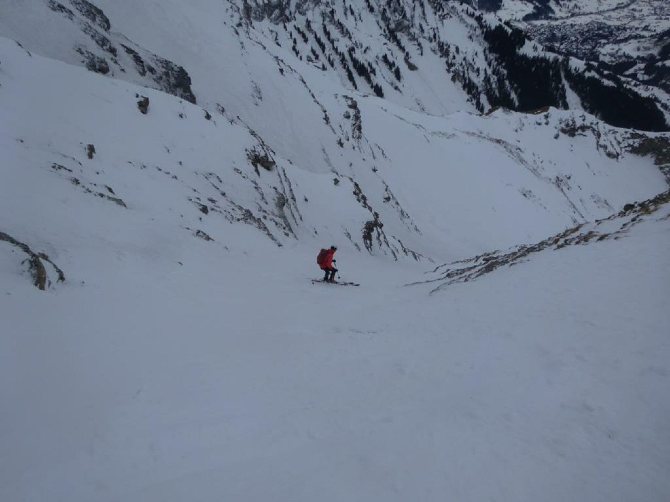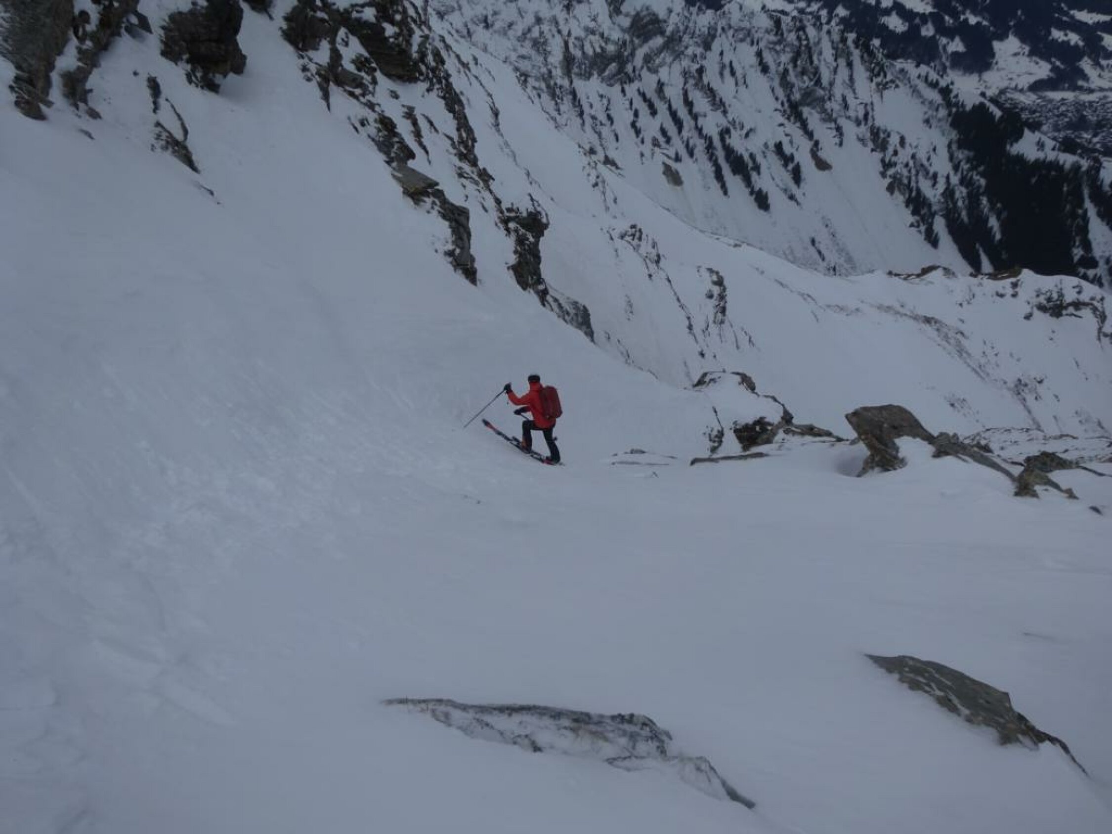 Im Couloir genug und griffiger Schnee und keine rausschauenden Steine. Wo es breiter wird, war leider Wind-/Bruchharst bis auf ca. 1800m runter. Darunter dann weicher, schwerer und etwas klebriger Schnee, aber schön fahrbar.