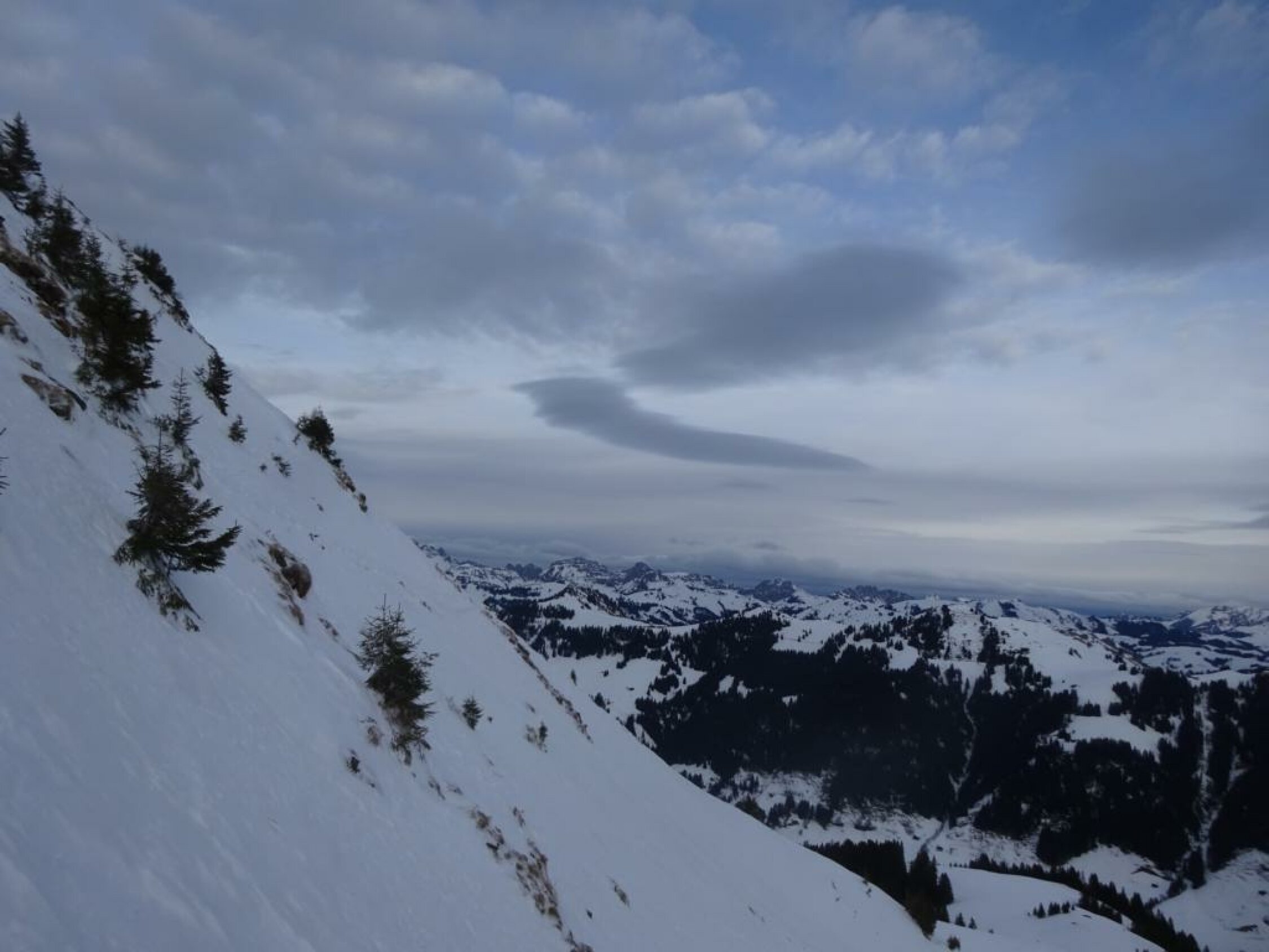 Anfangs noch schön, ab 10 Uhr hat es angefangen zuzuziehen und war um 11 auf dem Gipfel recht trüb und schneite ein wenig. Für die Abfahrt wurde es aber wieder etwas klarer und war es sichtig genug.