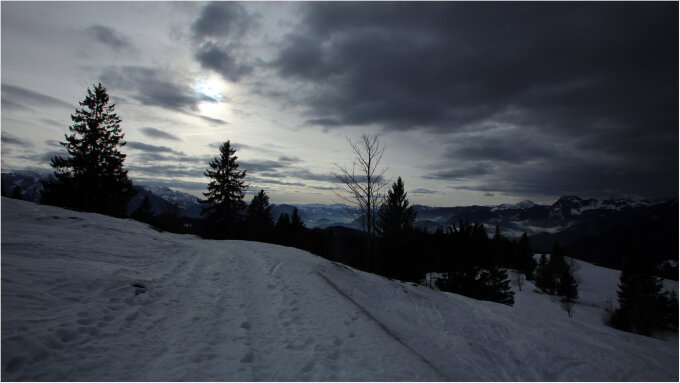 Die Verhältnisse sind, sowohl zu Fuß als auch mit Skiern ziemlich miserabel. Unten liegt ohnehin wenig Schnee, mit zunehmender Höhe wird zwar der Schnee mehr, jedoch ist die Schneedecke bis zum Boden durchweicht. Es hat bis über Gipfelhöhe hianuf geregnet. Ein wenig besser ginge es mit Schneeschuhen. Auf dem Gipfel kräftiger Wind aus West, nicht wirklich kalt.