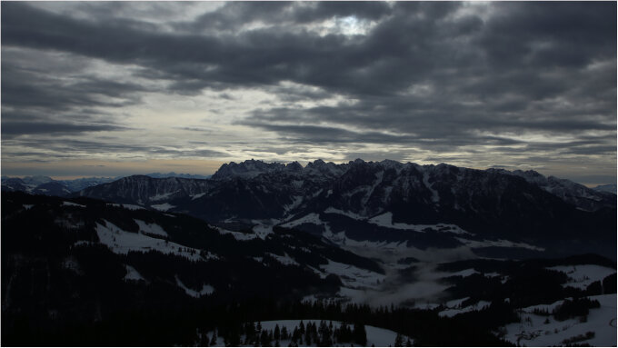 Blick in die Runde. Sowohl in den gesamten Chiemgauer Alpen bis hin zum Zahmen Kaiser ist die Schneedecke offensichtlich durchweicht.