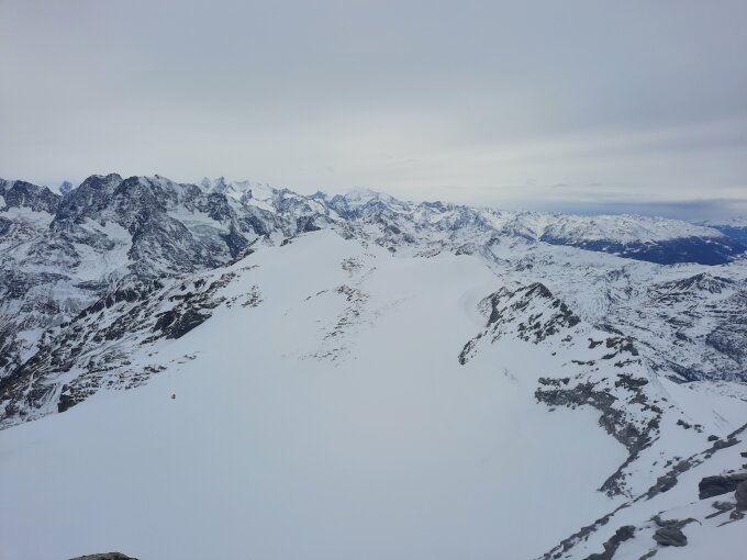 Schnee verharscht, aber reicht. Querung griffig. Spur bis zum Breithornpass und auf dem Grat. Großer Bergschrund, mit Brücke. Grat gut machbar