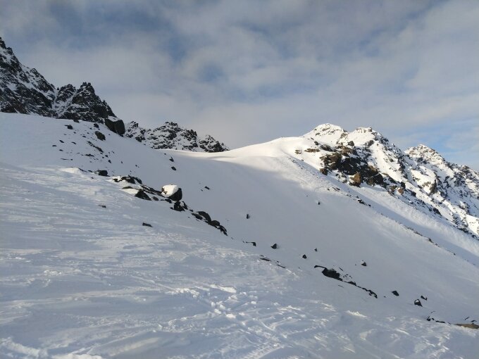 Im Aufstieg harte Spur, teilweise leicht glasig. Den stark verfahrenen Gipfel haben wir nicht mitgenommen, dafür den Pass links vom Chlein Schwarzhorn gemacht. Dieser Hang wechselnd Pulver/Harsch, Mittelteil ruppig bei harten alten Spuren. Den Spuren links gefolgt und im untersten Hang Pulver in der Abfahrt (über dem See gelegen)