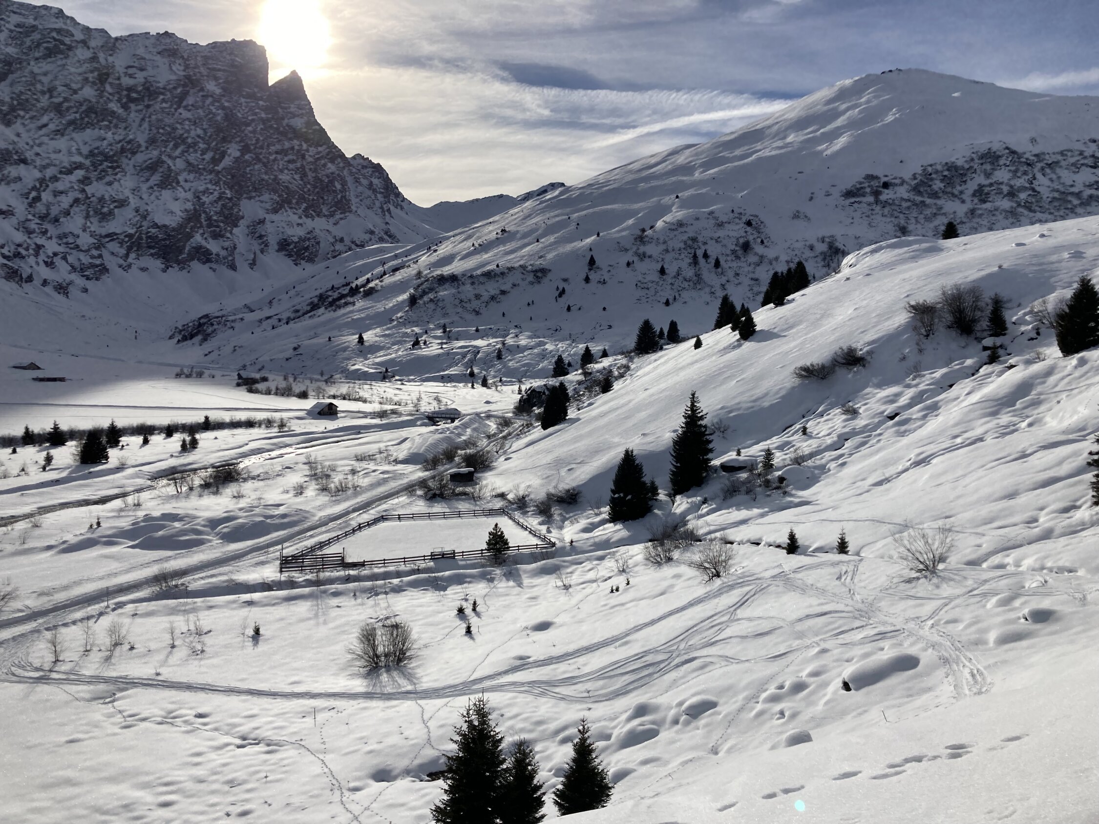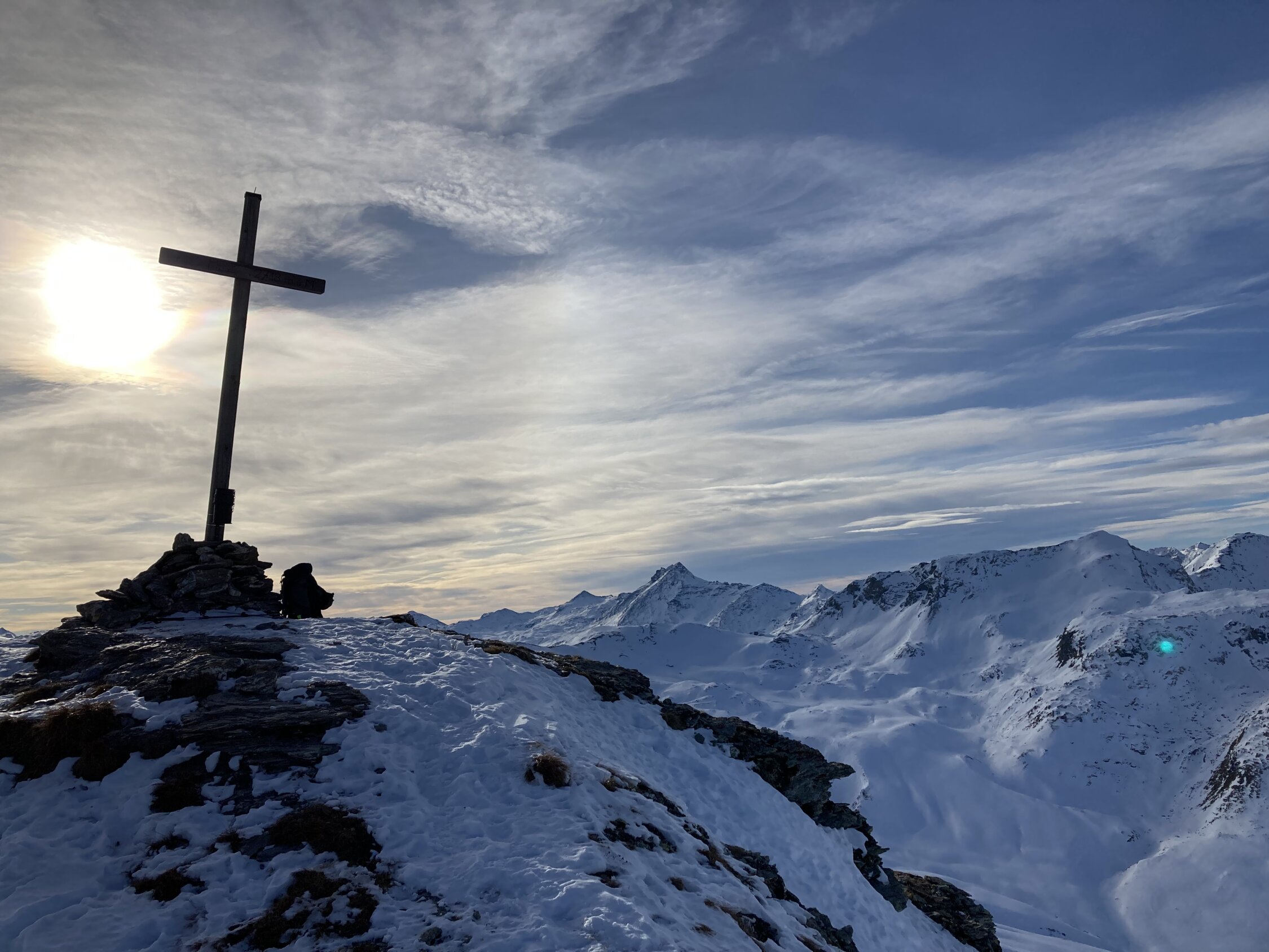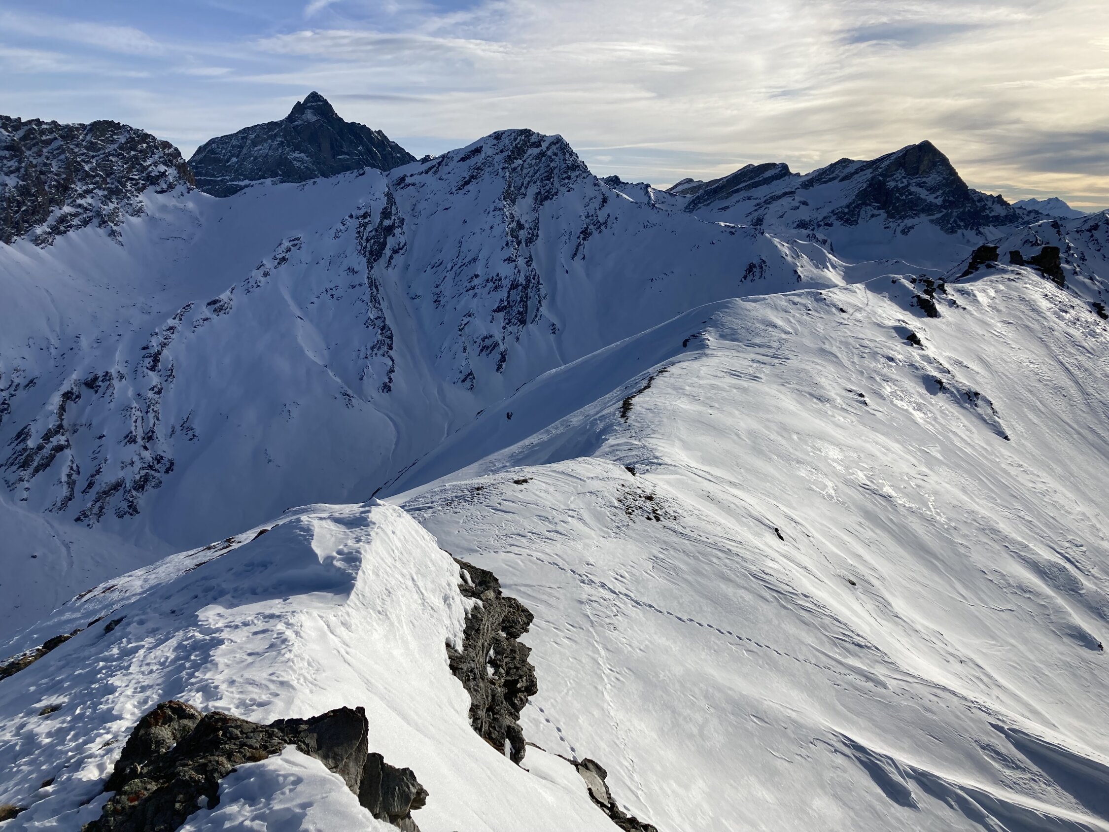 Tour ist gut eingespurt. Schneeverhältnisse für die Abfahrt durchwachsen. Windexponierte Bereiche abgeblasener Hartschnee, in den Mulden zum Teil noch Pulverschnee.