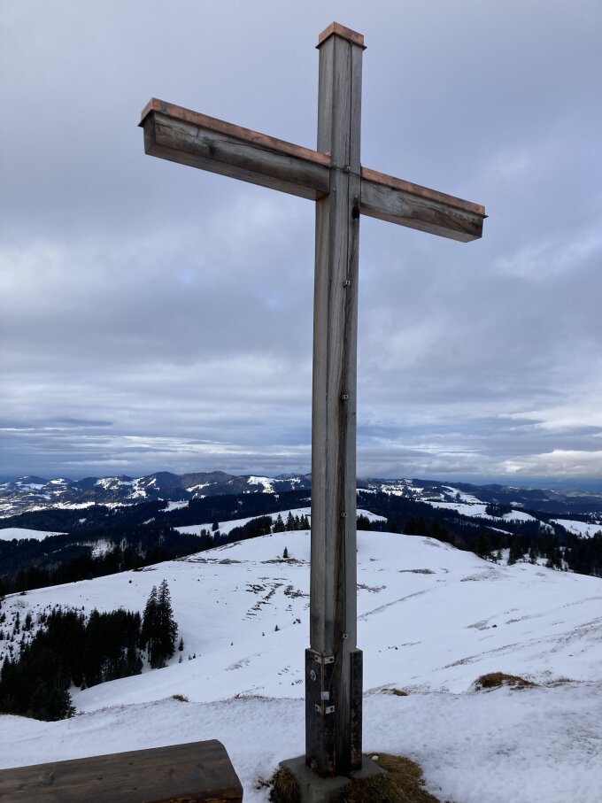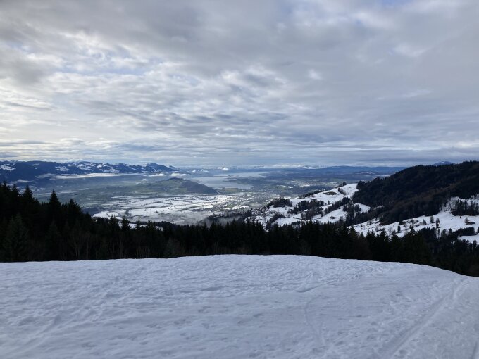 Es hat vom Parkplatz weg noch genügend Nassschnee bis auf den Gipfel.