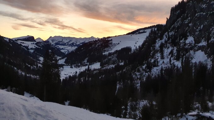 Wollte das angekündigte kurze Aufhellungsfenster nutzen. Start in der Dämmerung bei -2.5 Grad.