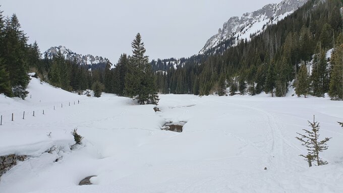 Ab Brätliplatz dann der Strasse entlang kein Vergnügen mehr, da die Fuss-, Schneeschuh- Ski-Spuren im hart gefrorenen Schnee herausfordernd waren. Am Schluss neben den beiden Weidhütten wieder schöner auf hater Unterlage über die Wiese zu fahren.