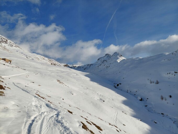 Ab Pontresina bis auf ca. 2300 im Regen aufgestiegen, dann den restlichen Tag mit Sonnenschein. Entsprechend die Schneeverhältnisse. In den Hängen um den Laj Languard und die Lajs d'Albris dann teilweise mittelschwerer Pulverschnee. Die Felsblöcke müssen mit entsprechendem Spürsinn umfahren werden... Umgekehrt auf Höhe Lejs d'Albris aus zeitlichen Gründen.