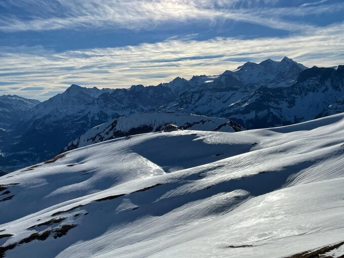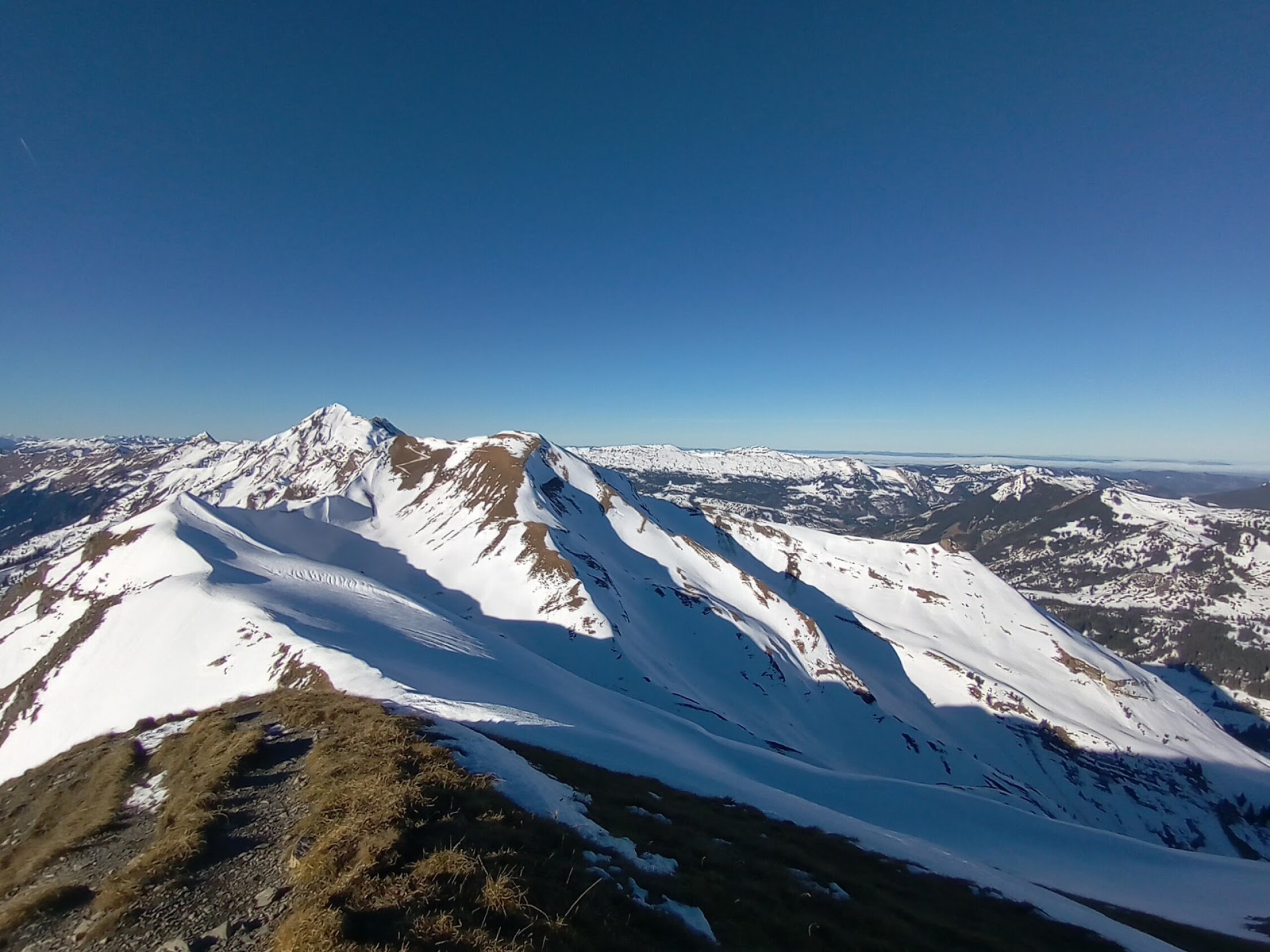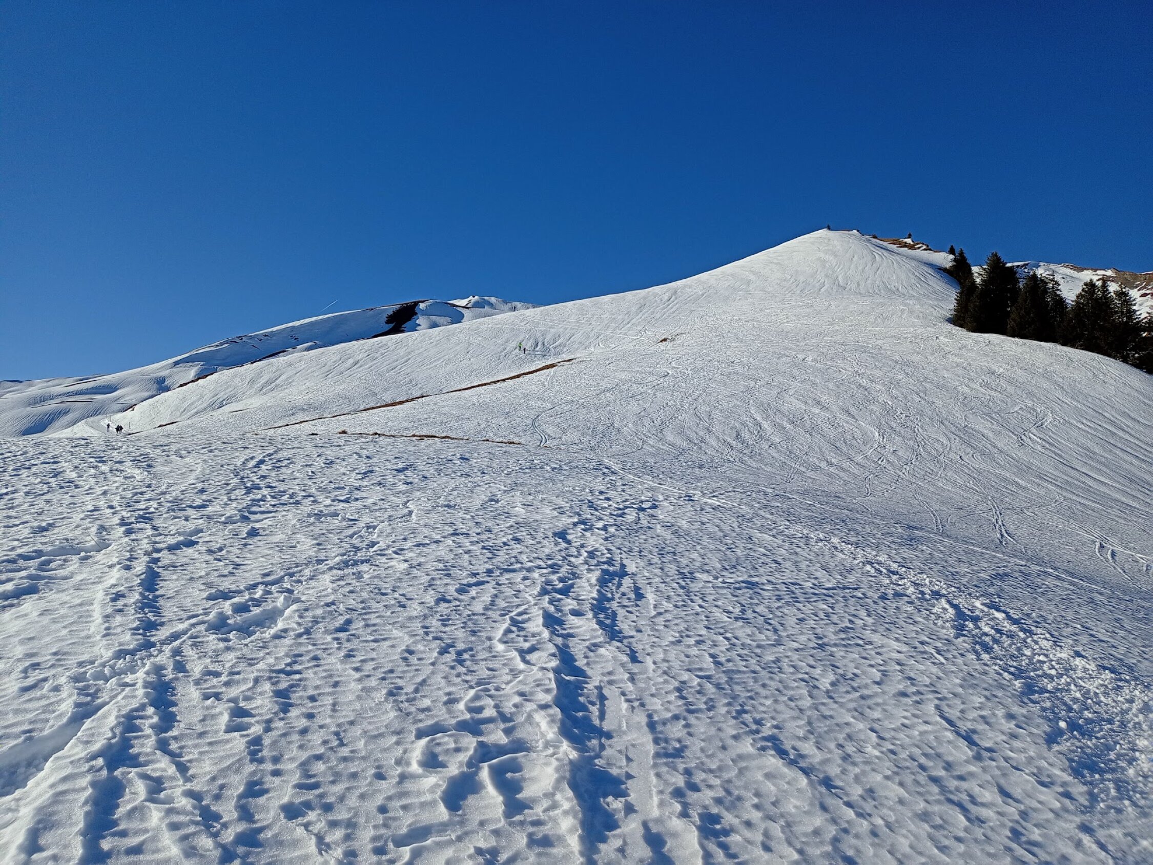 Am Morgen schön griffiger Schnee. Bei richtiger Routenwahl noch bis zum Gipfel Schnee. Der Regen hat seine Spuren hinterlassen und es gibt schon einige aperen Stellen. Wird sind über den First aufgestiegen welcher schon aper war.