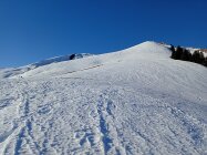 Auf der Abfahrt den richtigen Zeitpunkt und Hangausrichtung erwischen und man hat eine wunderschöne Firnabfahrt. An den schattigen Plätzen holperig. Noch genügend Schnee bis zur Bergstation.