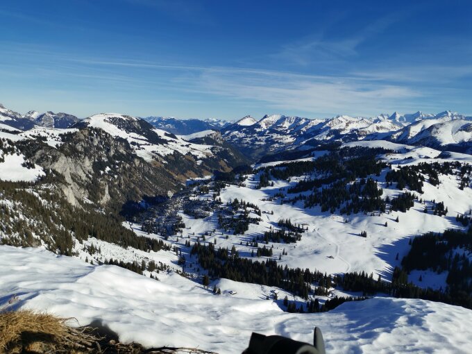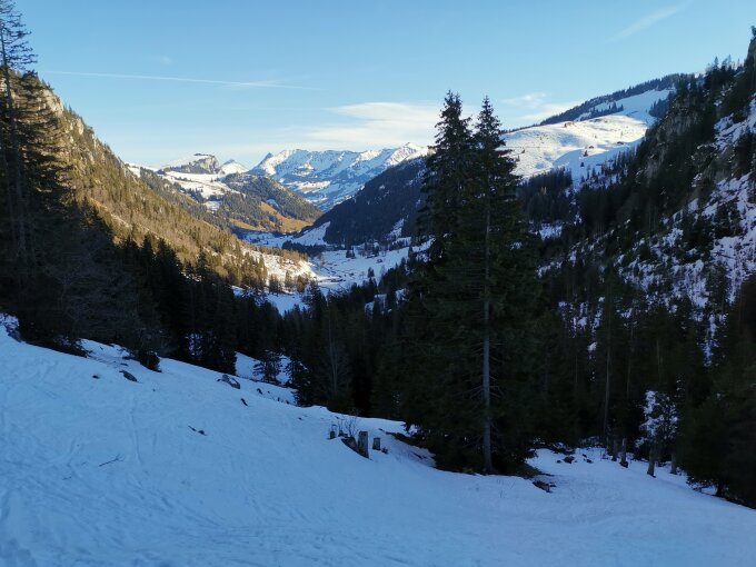 Durchgehend Schnee auf der Route, sonnseitig bei der Abfahrt (nach 13:00) schöner Frühlingssulz, schattseitig Hartschnee.