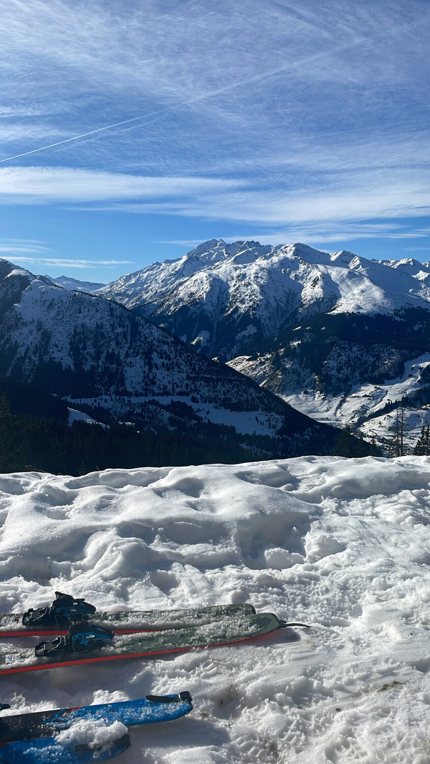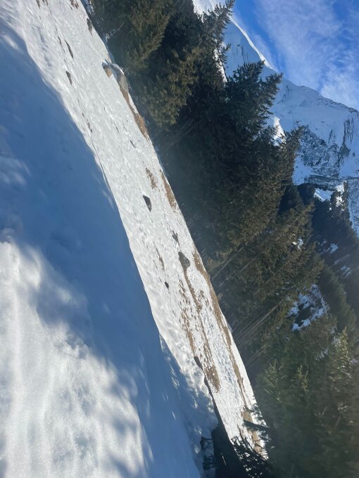 Oben gute Sulzschnee, unten wegen Schneemangel auf den Weg fahren.