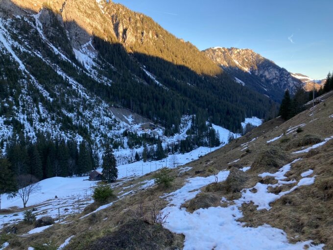 Unten beim Parkplatz nur noch wenig Schnee, die Ski mussten aber nicht getragen werden. Ab Nidegg dann durchgehende Schneedecke. Bei Aufbruch um 8.30 Uhr war es bereits 1.5 Grad warm.