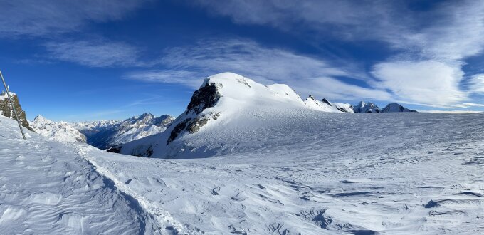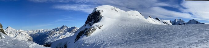 Das Breithorn ist um diese Jahreszeit wegen der starken Winde meist so abgeblasen, dass das Blankeis herausschaut - viele gehen deshalb nicht mit Ski bis zum Gipfel, stattdessen Steigeisen im Einsatz. Dafür kaum lawinengefährdet.