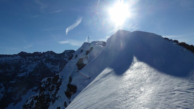 Wetter Standesgemäß bestens zum Jahresauftakt. Bis Entschenalp Schneefrei, mit Bike möglich ab Schöllang. Ab dort zwar gespurt (aber wie !?!) z.T. sehr glatt und sehr tief. Anstrengend weiter ins Wännele und Falkenjoch, aber nie "gemütlich". Am Beginn vom NW-Rücken noch brauchbare u.z.T.tragende Spur, die vor Latschengasse endete. Von dort mußte ich ziemlich mühsam einspuren. Nach den Latschen aper bis Gipfelwandl. Dort kombiniert, (Fels trocken) zum Gipfelgrat. Hatte Steigeisen dabei, oben auch genutzt.