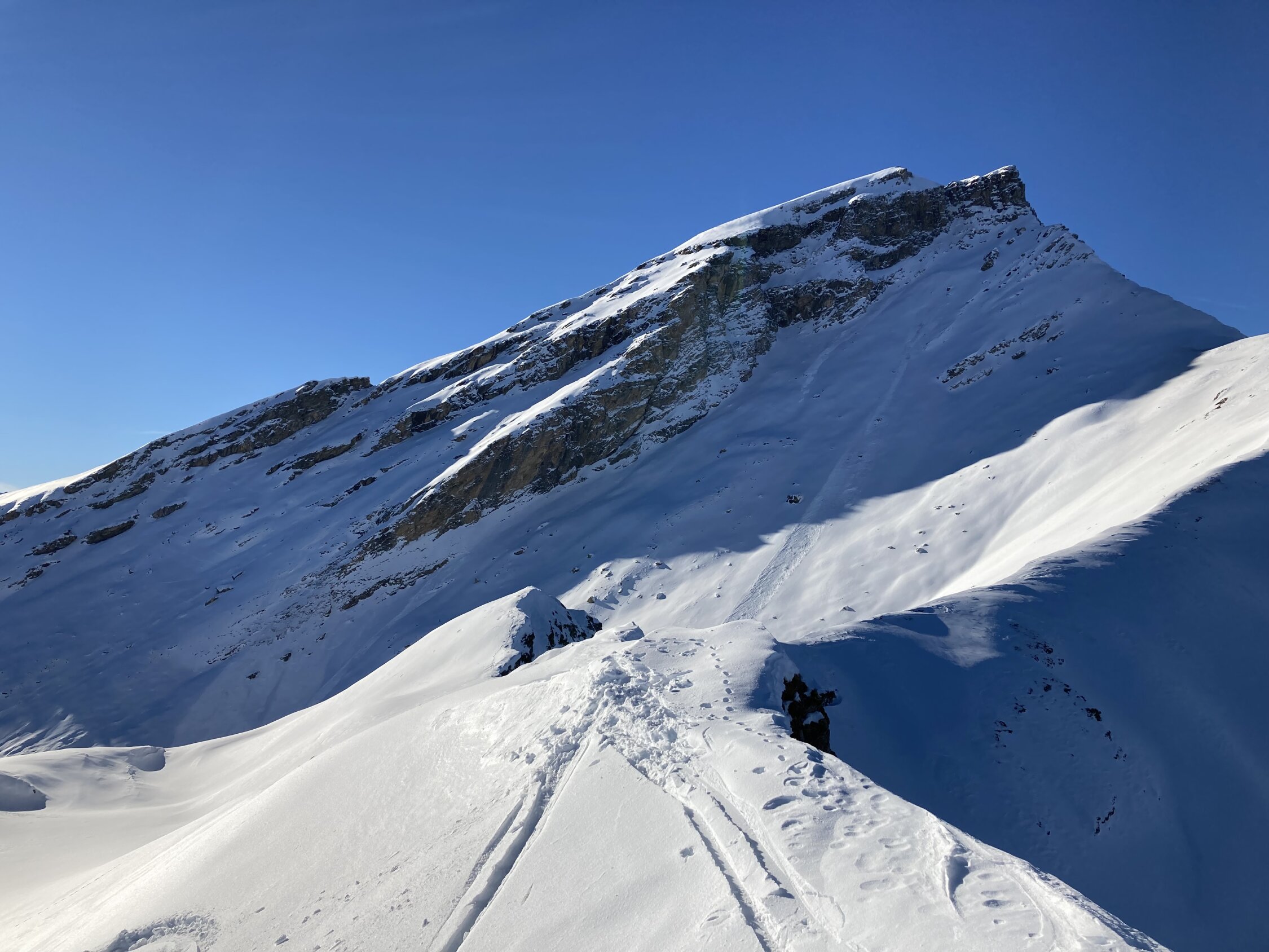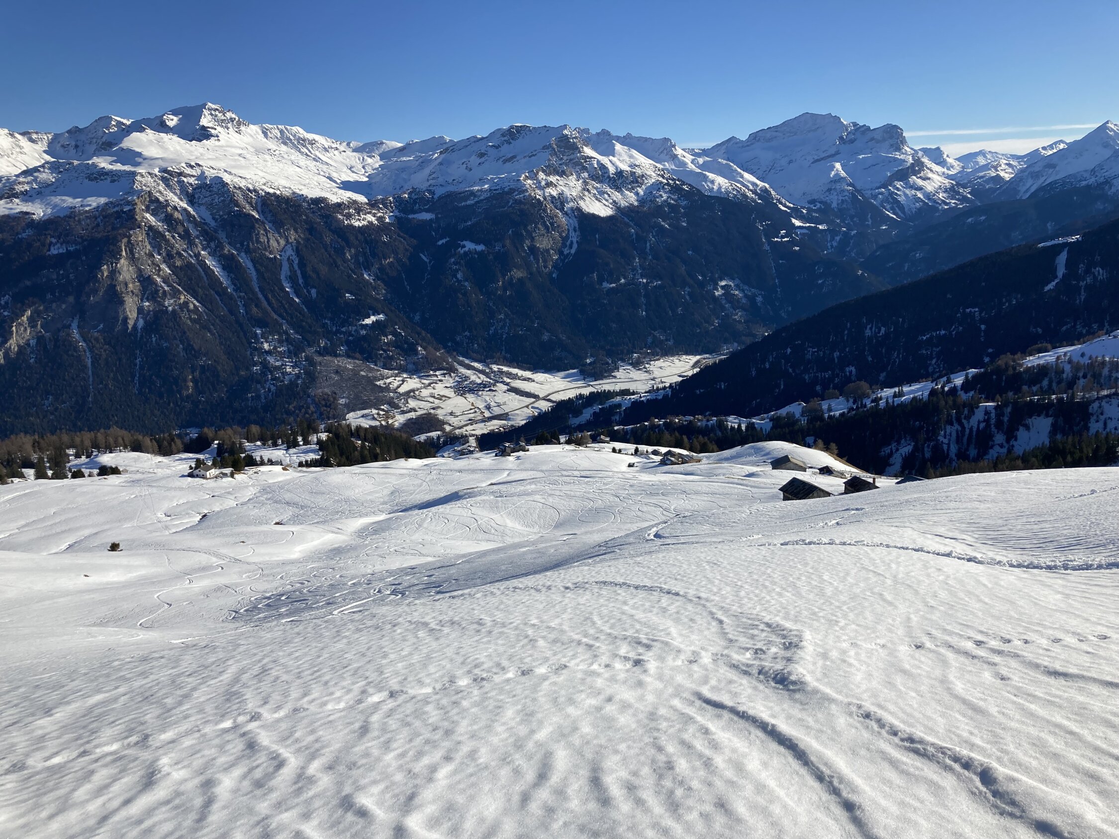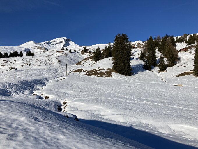 Für den Start ab Mathon gerade noch genügend Schnee. Für die Abfahrt ist aufgrund der mauen Schneelage ab Mursenas die Schlittelpiste zu bevorzugen.