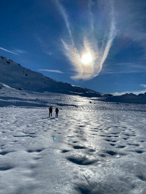 Die Strasse ging gut bis Tiefenbach zu fahren. Von da sind wir nach Tätsch aufgestiegen und über grauenhaften Schneeverhältnisse bis zum Hotel Galenstock gefahren.