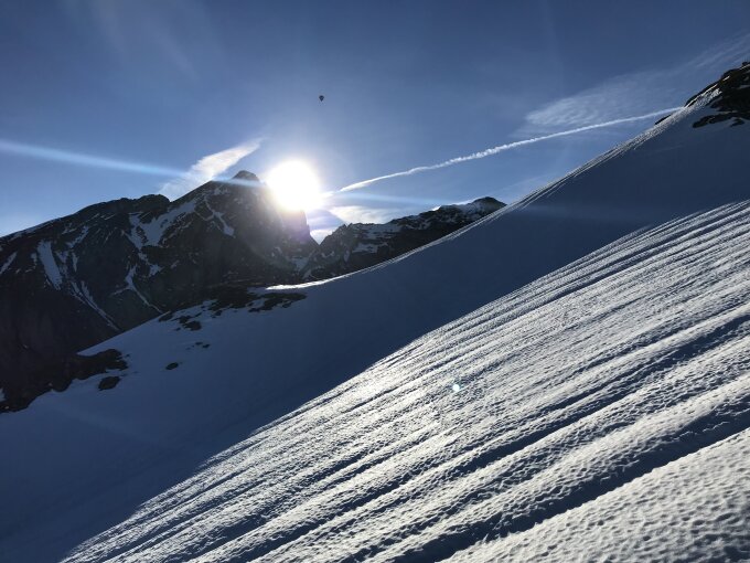 Klasse Abfahrt vom Gipfel um 11:30 Uhr, da leicht aufgefirnt, so dass man aber nicht durchbrach.