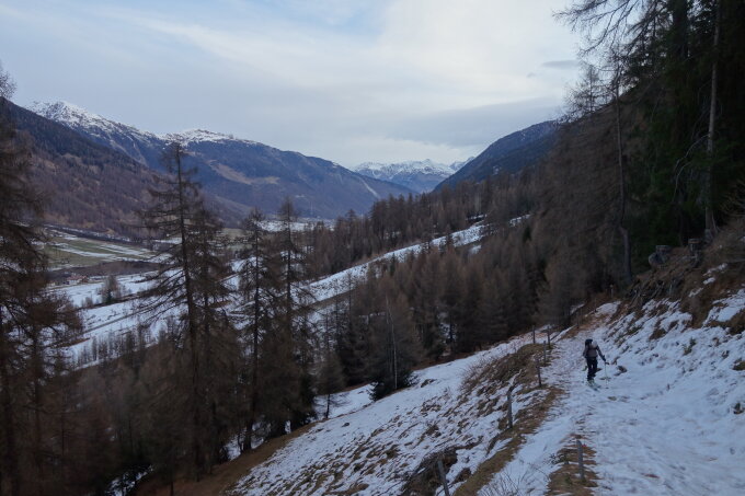 Nachdem wir gestern in der Abfahrt auf Valchava die Skis teils tragen mussten, hatten wir das für die Umbrailstrasse auch befürchtet, man muss aber nur in der Abkürzung auf 1600 m im Wald ca. 100 m rauf tragen, runter etwas mehr (wenn die Skis nicht zu sehr leiden sollen), die Strasse hatte dann am Randstreifen immer ausreichend Schnee zum rauf und runterkommen.