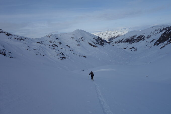 Erstaunlich gute Schneeverhältnisse, hier hat der Regen nicht so gewirkt, am ehesten um 2200 m hatte es Krustenansätze, darüber oft lockerer Schnee, teils windgepackt.