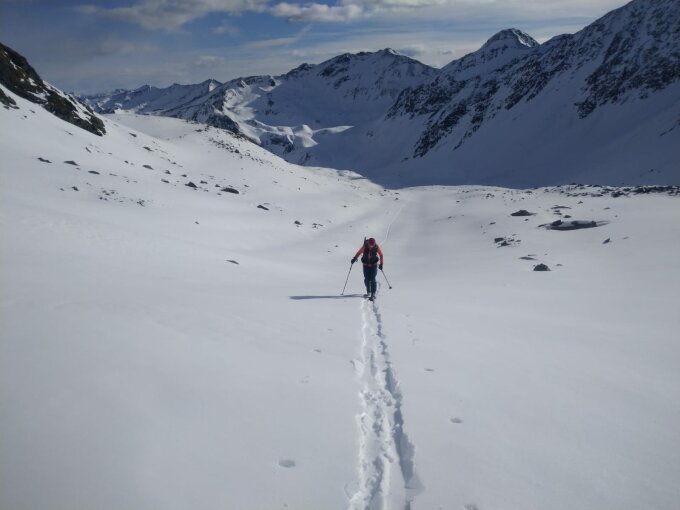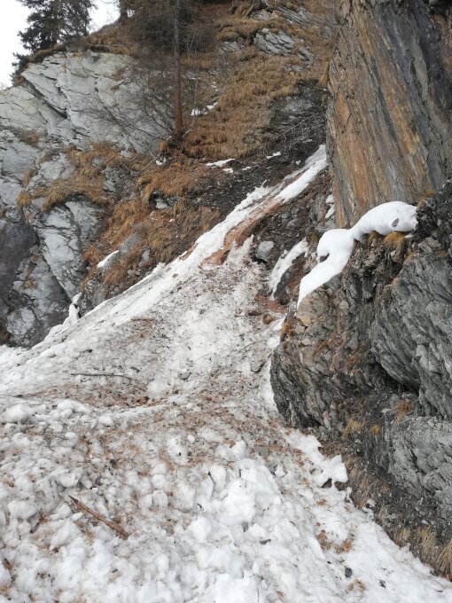 Beim Skidepot erst sehr steil hinunter Richtung Lasnitzehütte und dann weiter auf Fahrweg nach Prägrsten. Aber Achtung, hier muss man sich erst erkundigen wie die Verhältnisse sind. Viele Gefahren lauern auf dieser Strecke. Viele steile Passagen die man queren muss und ab der Lasnitzen Hütte einige Tobel mit vielen Lawinen drinnen. Unbedingt vor Info bei den einheimischen!