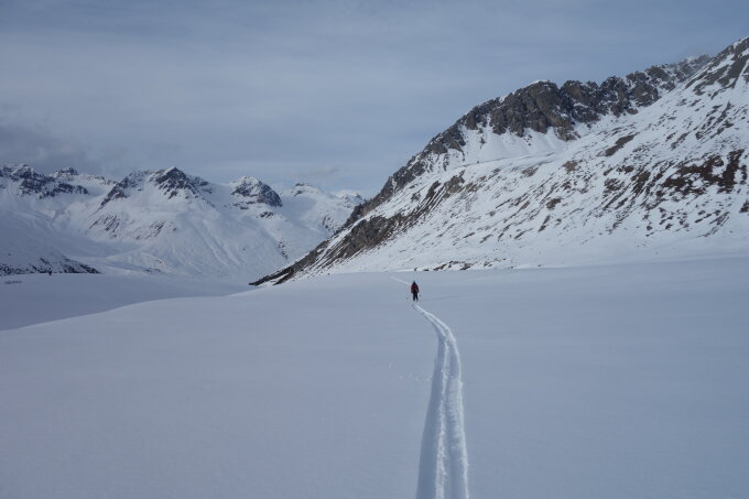 Ab Lü hat es Schnee auf dem Forstweg, Schmelzharsch gab es wiederum unterhalb 2400 m, darüber teils pulvrig, oben Windharsch und die Südhänge hatten oben auch Schmelzdeckel (wohl nie so richtig gut aufgefirnt), durch den man teils einbrach.