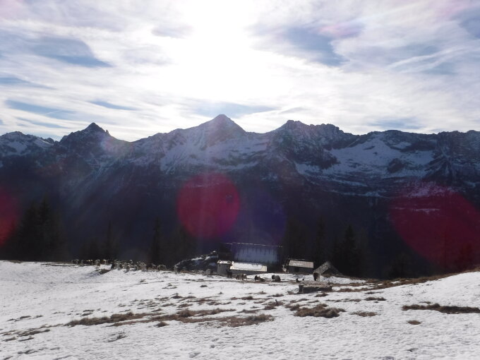 Tourenbeginn um 08:55 Uhr bei 11°C unter klarem Himmel. Durchgängige Schneeauflage erst ab dem Possette-Pass. Unangenehmer Bruchharst, wo man stellenweise selbst mit Schneeschuhe in darunter befindlichen Schneepulver durchbrach.