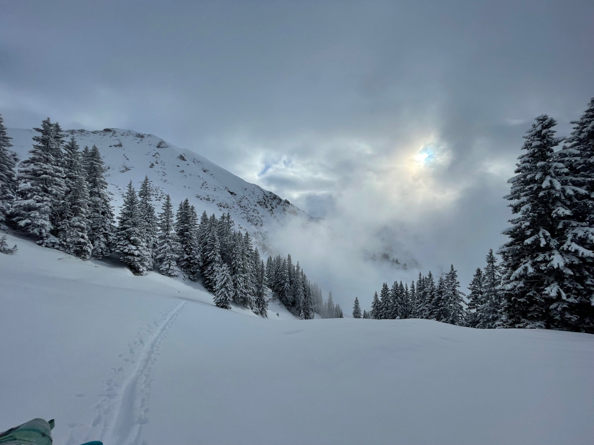 Sehr wenig Schnee unten im Wald. Gerade so viel dass man mit Fellen aufsteigen kann. Ab ca. 1550hm gibt es unterhalb des schönen Neuschnee's (ca. 20-30cm) auch eine alte Schneedecke. Ab dieser Grenze kann man oberhalb auch ohne Materialschäden Skifahren.